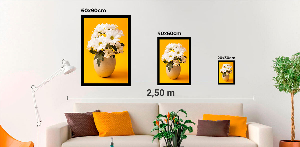 Para te ajudar a ter uma melhor noção de proporção, observe as imagens ilustrativas abaixo. Elas mostram como os quadros se encaixam em diferentes contextos, como em relação a um sofá de 2,5 m de largura ou a uma pessoa de 1,65 m de altura.